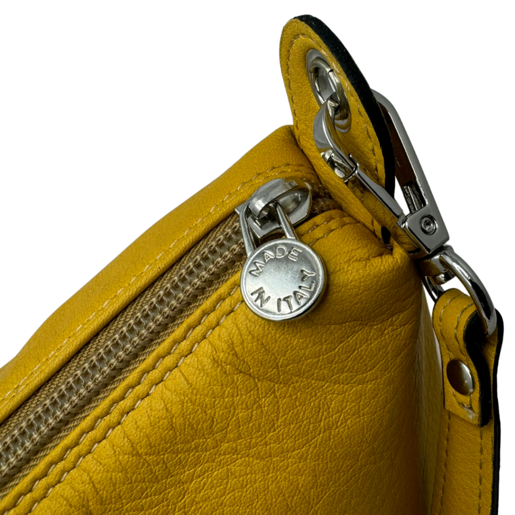 Borsa a spalla in vera pelle di vitello nappato, con tracolla per un utilizzo versatile.Disponibile in diversi colori, tra i quali: giallo, verde e blu.