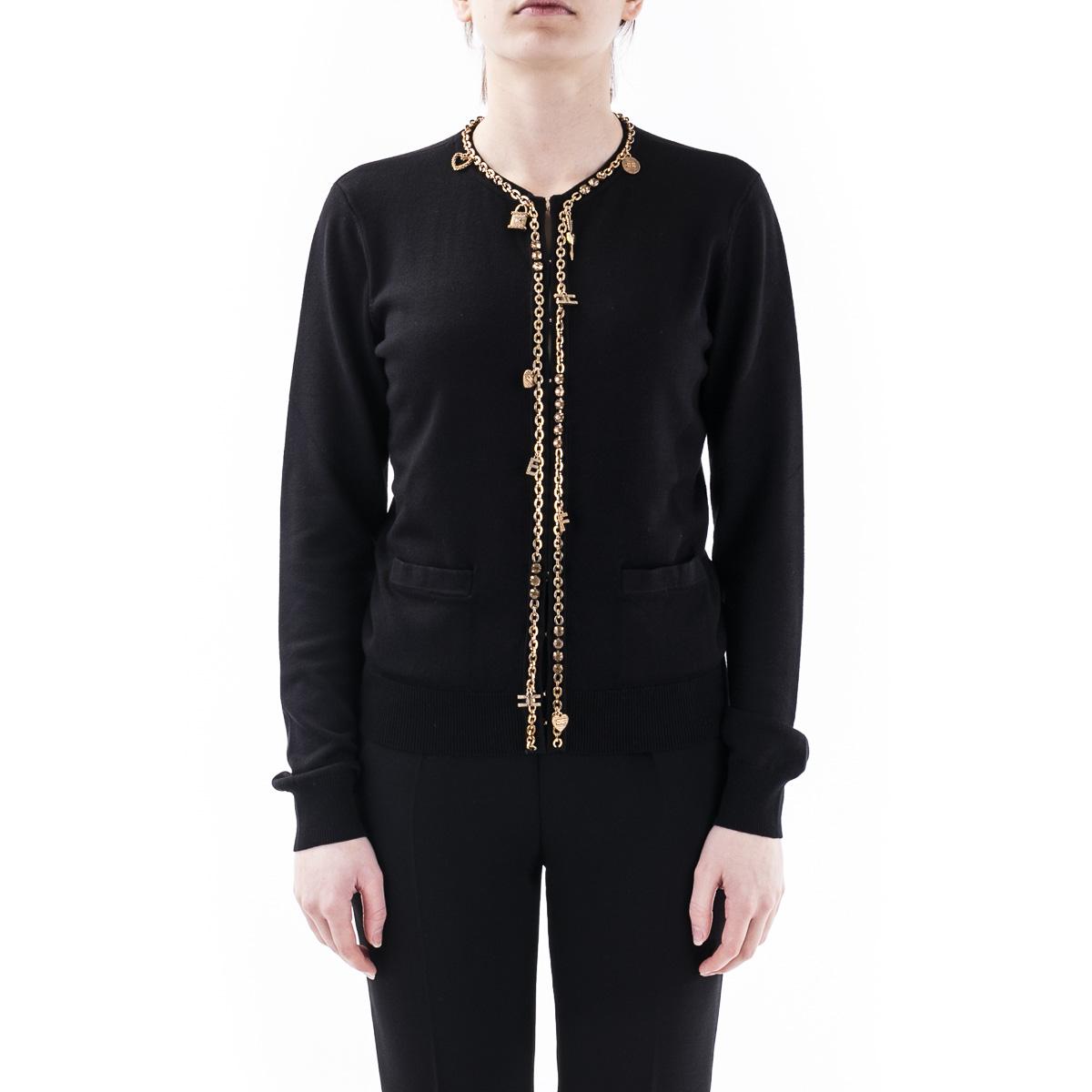 Cardigan Elisabetta Franchi a girocollo, chiusura con ganci e dettaglio catena con charms, due tasche frontali, disponibile nella variante beige e nera.