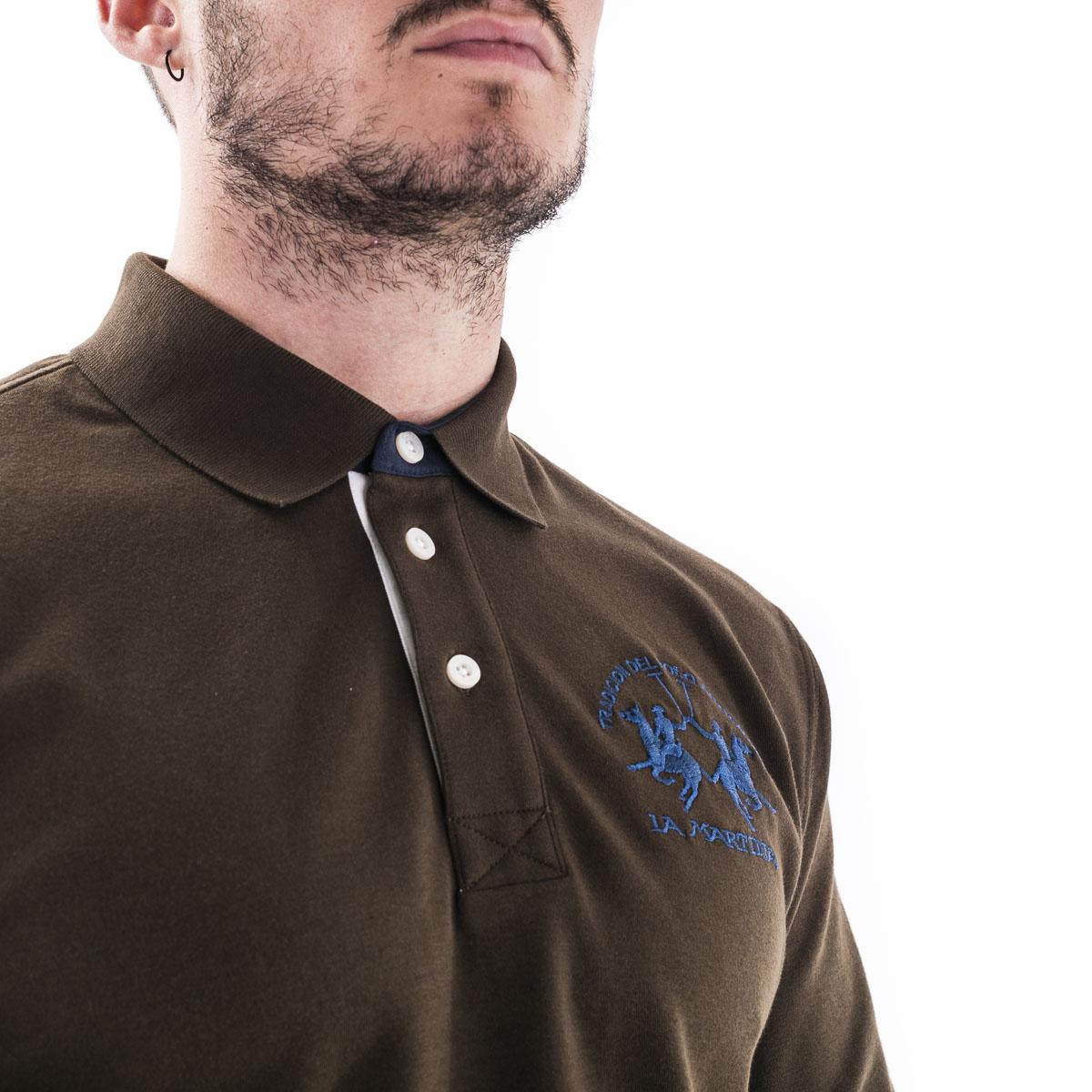 Polo La Martina da uomo a maniche lunghe in cotoneelasticizzato, regular fit, blu. Logo ricamato a contrasto sul petto e sotto il colletto. Disponibile nelle varianti blu e marrone.