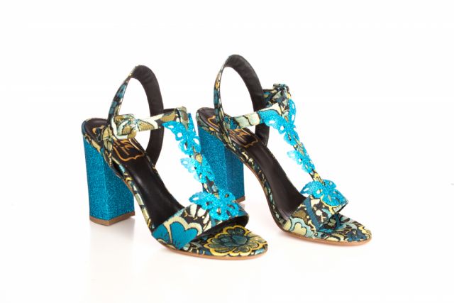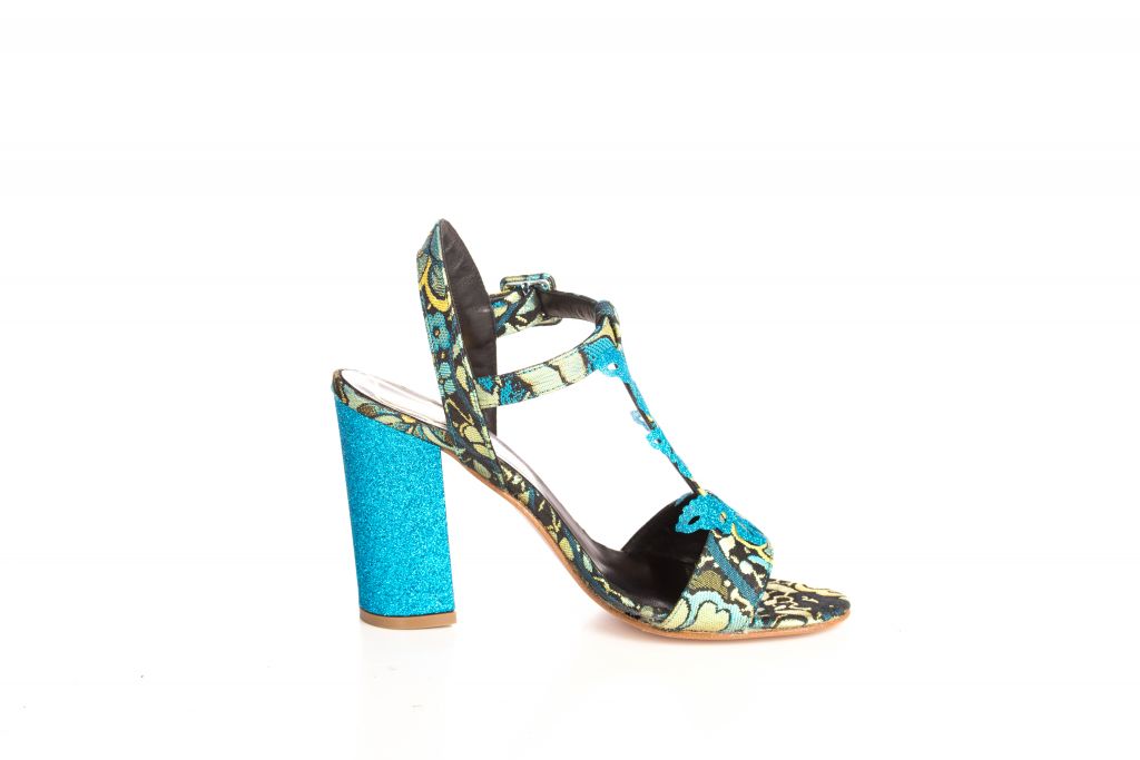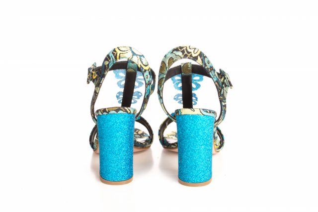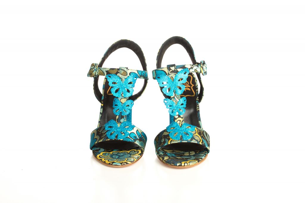 Sandalo in stoffa damascato con glitter azzurro e farfalle