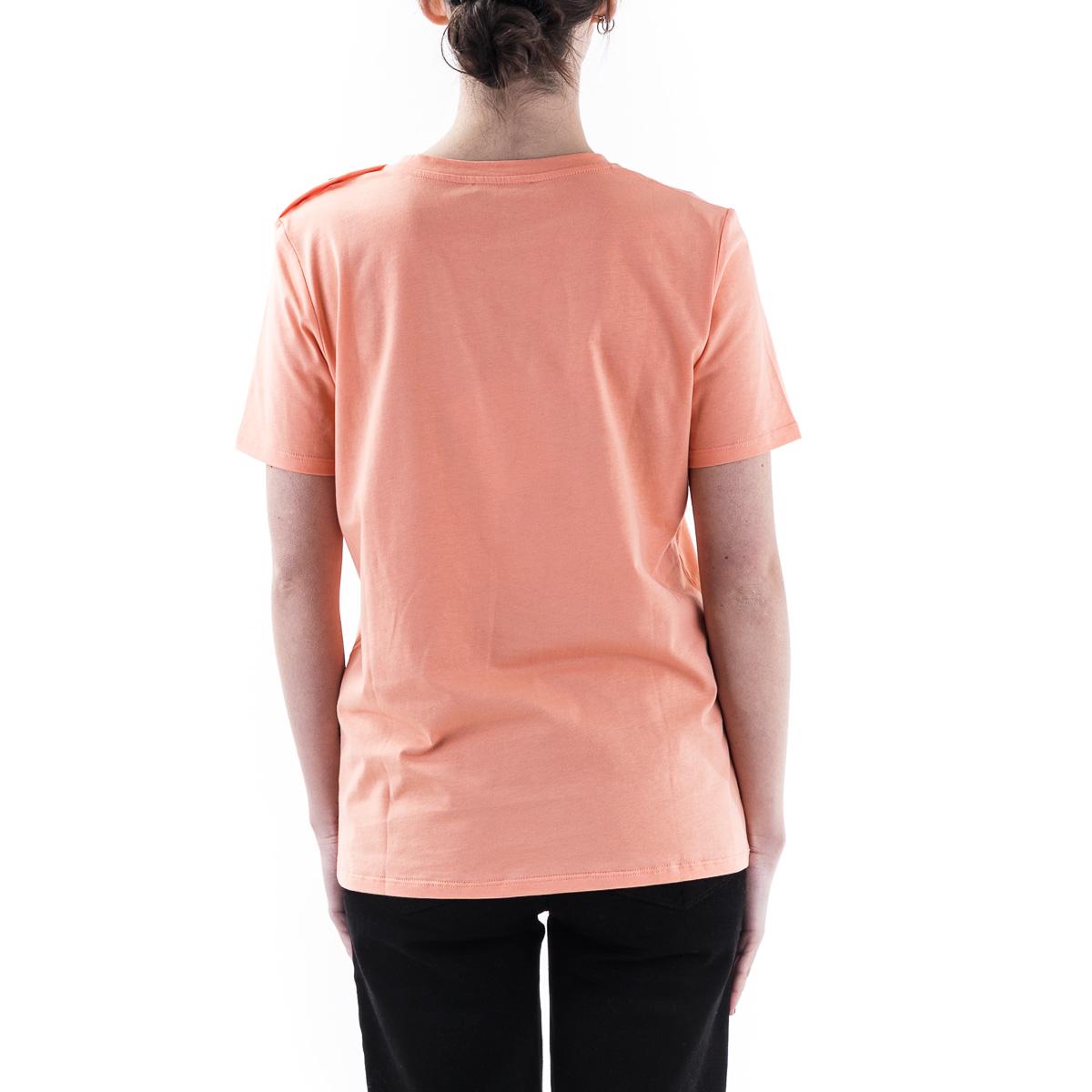 T-Shirt Balmain in cotone a girocollo con dettaglio bottoni oro sulla spalla, disponibile bianca con stampa logo su petto nella versione rosa e nera.