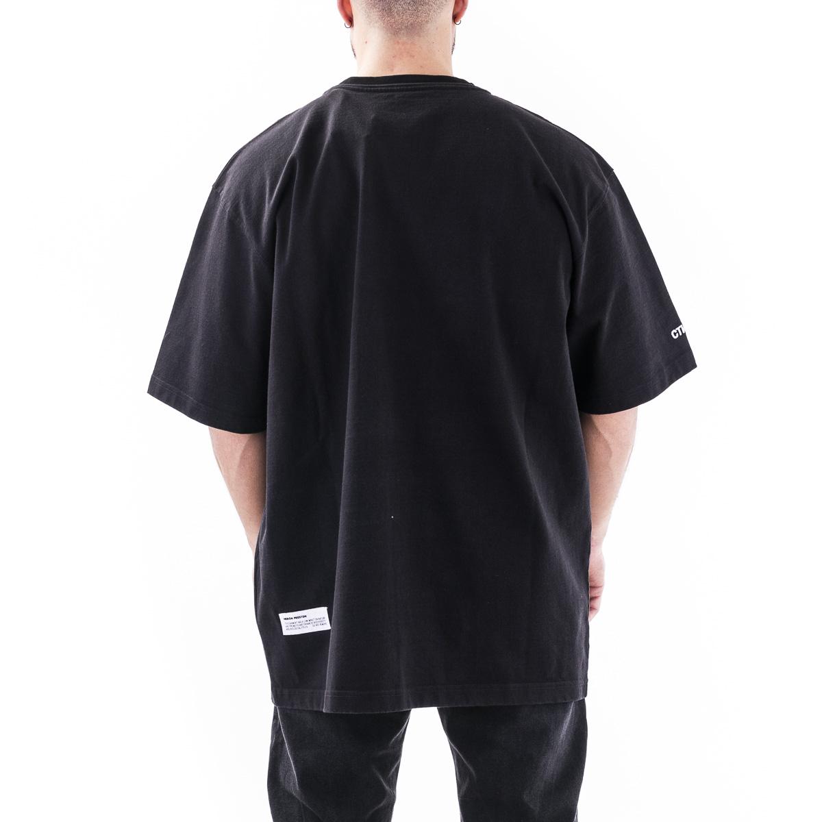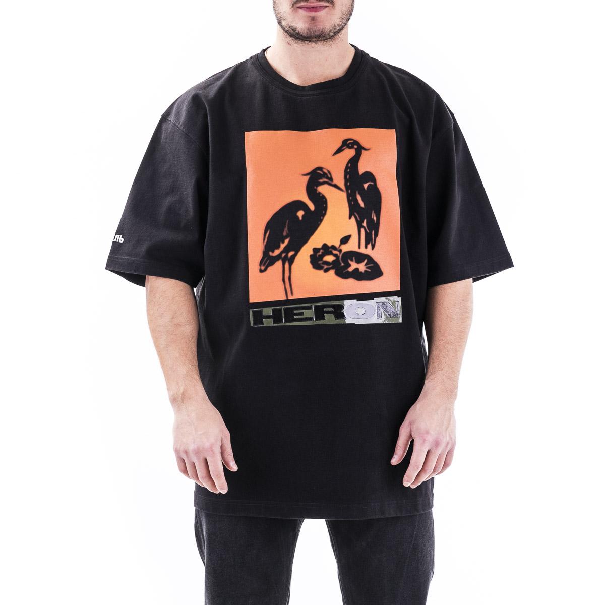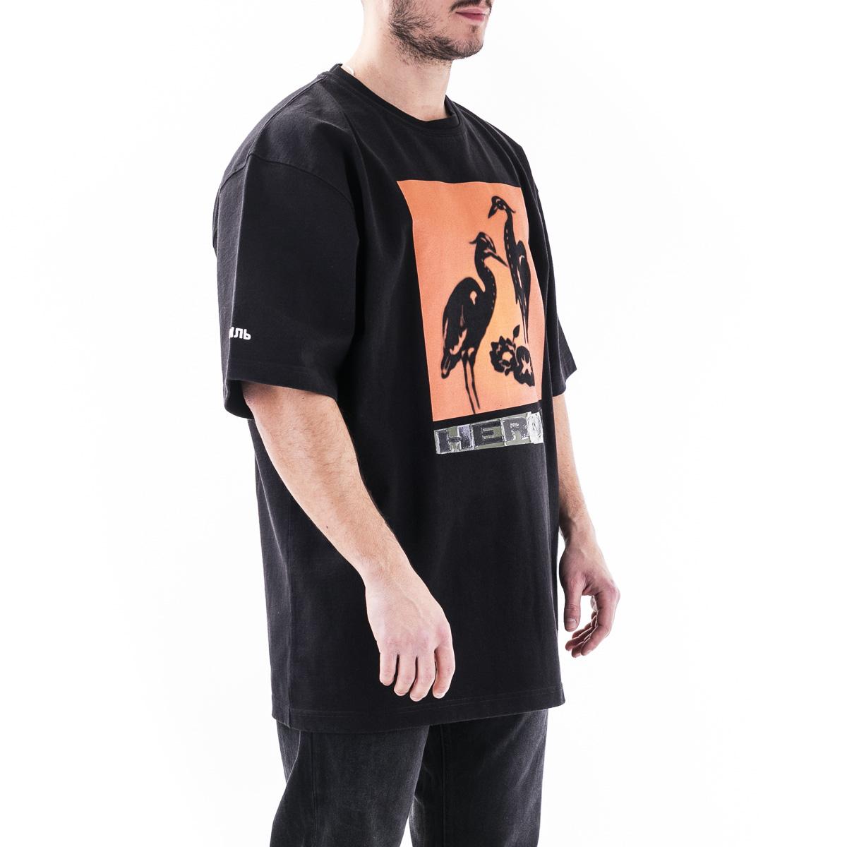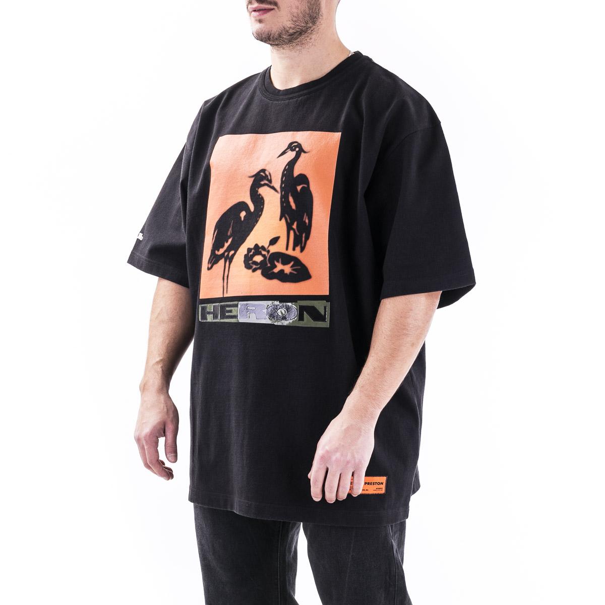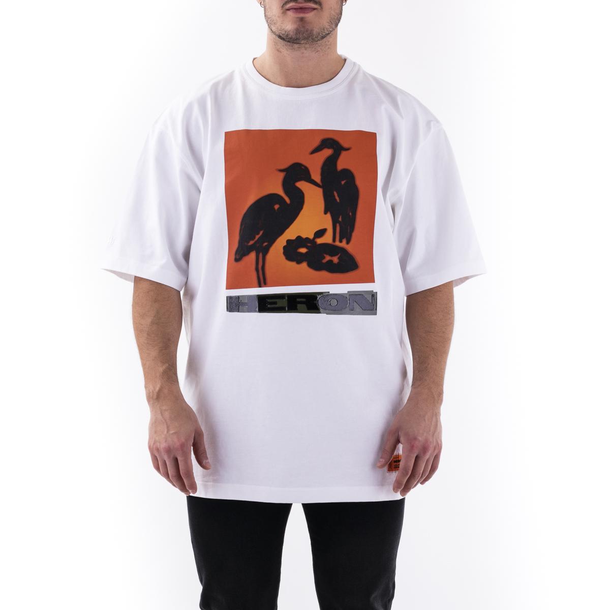 T-shirt Heron Preston in cotone, girocollo, stampa su pannello frontale e patch logo sul fondo, disponibile nella variante bianca e nera.