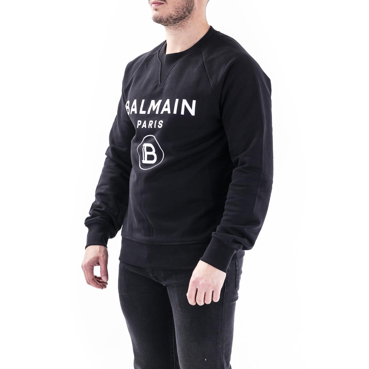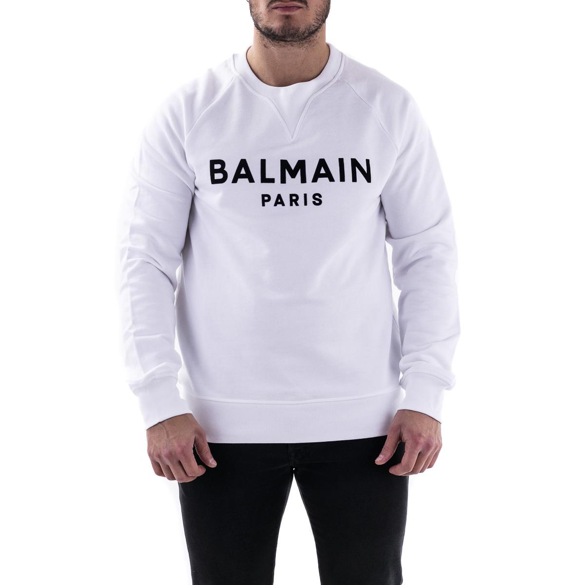 Felpa Balmain uomo in cotone, disponibile nella variante bianca e nera. Girocollo, collo polsini e fondo a costine. Stampa logo a contrasto sul pannello frontale.
