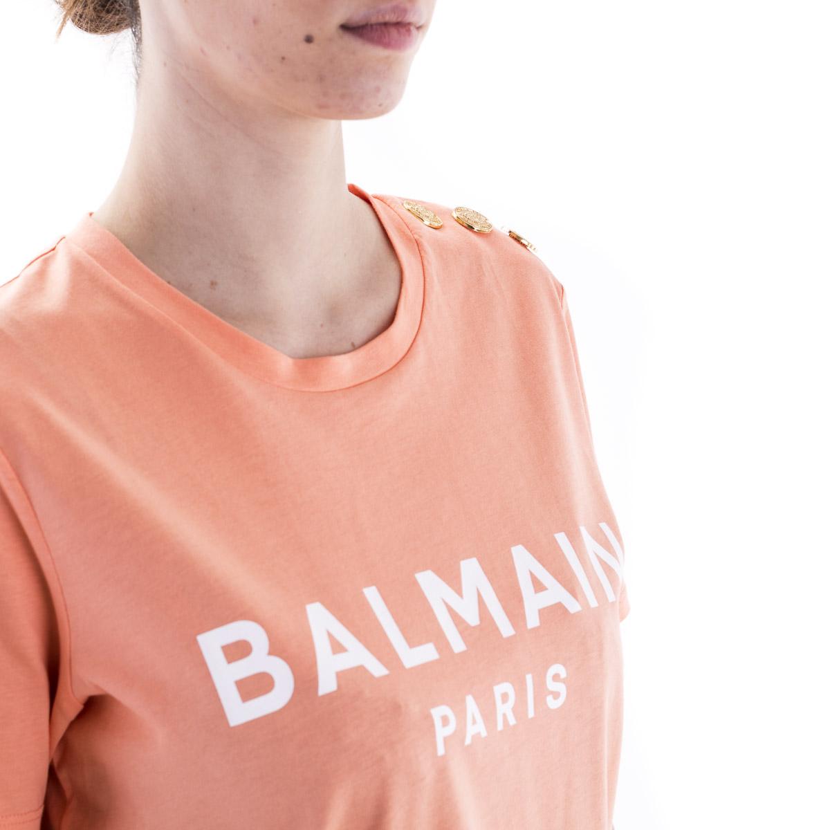 T-Shirt Balmain in cotone a girocollo con dettaglio bottoni oro sulla spalla, disponibile bianca con stampa logo su petto nella versione rosa e nera.