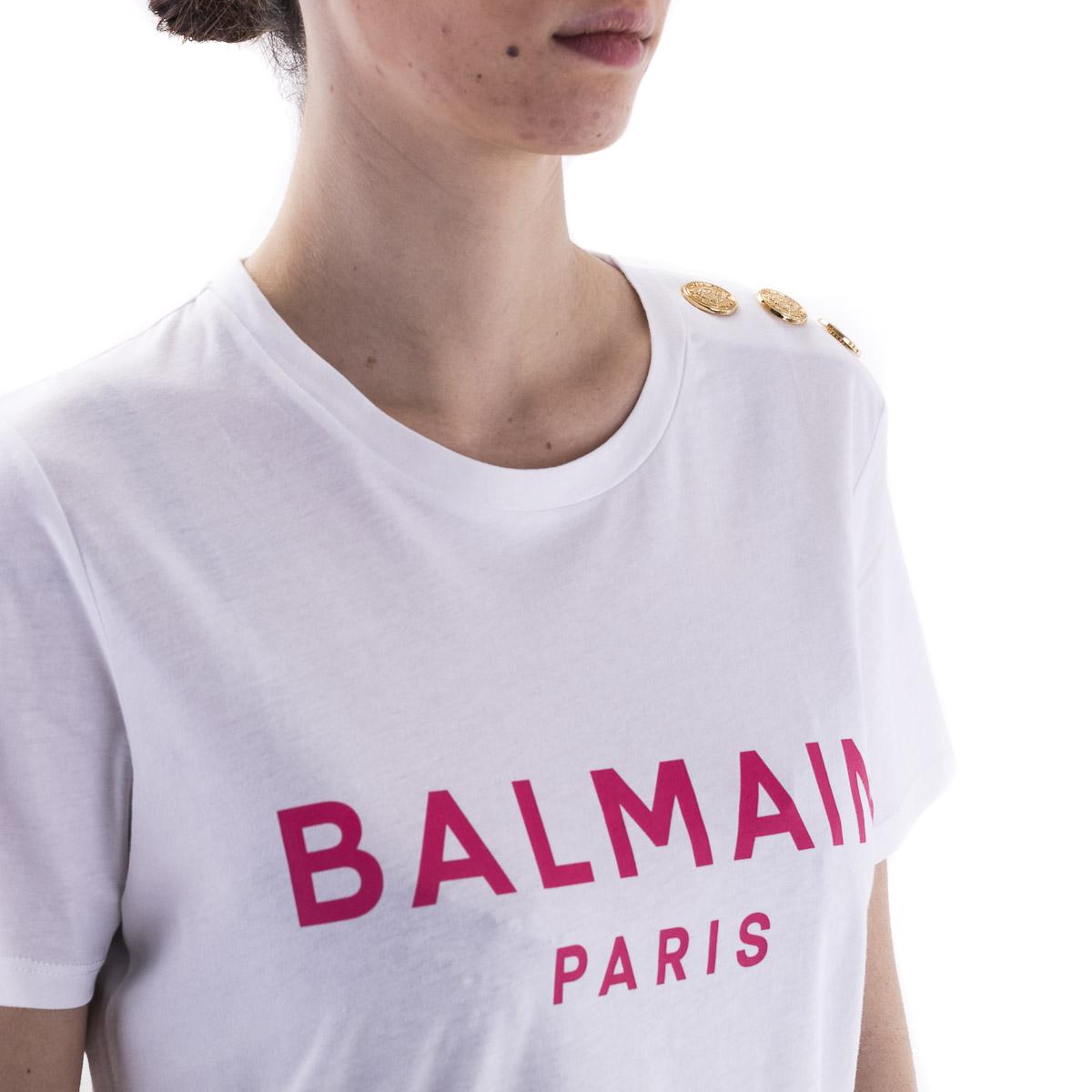 T-Shirt Balmain in cotone a girocollo con dettaglio bottoni oro sulla spalla, disponibile bianca con stampa logo su petto nella versione rosa e nera.